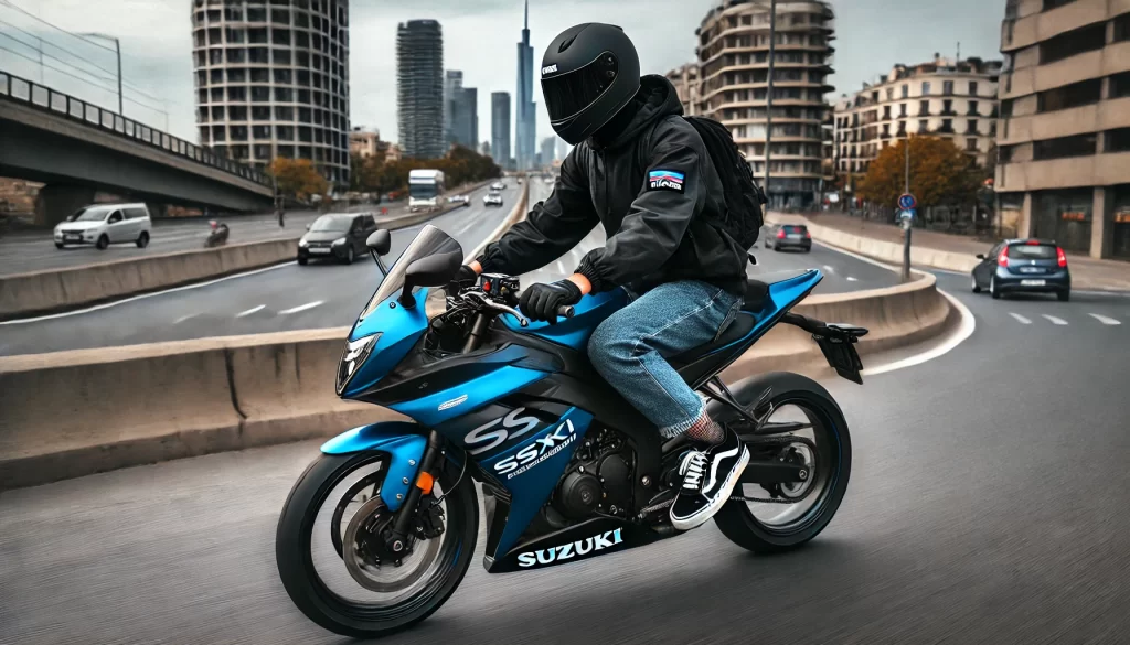 首元まで上げてバイクに